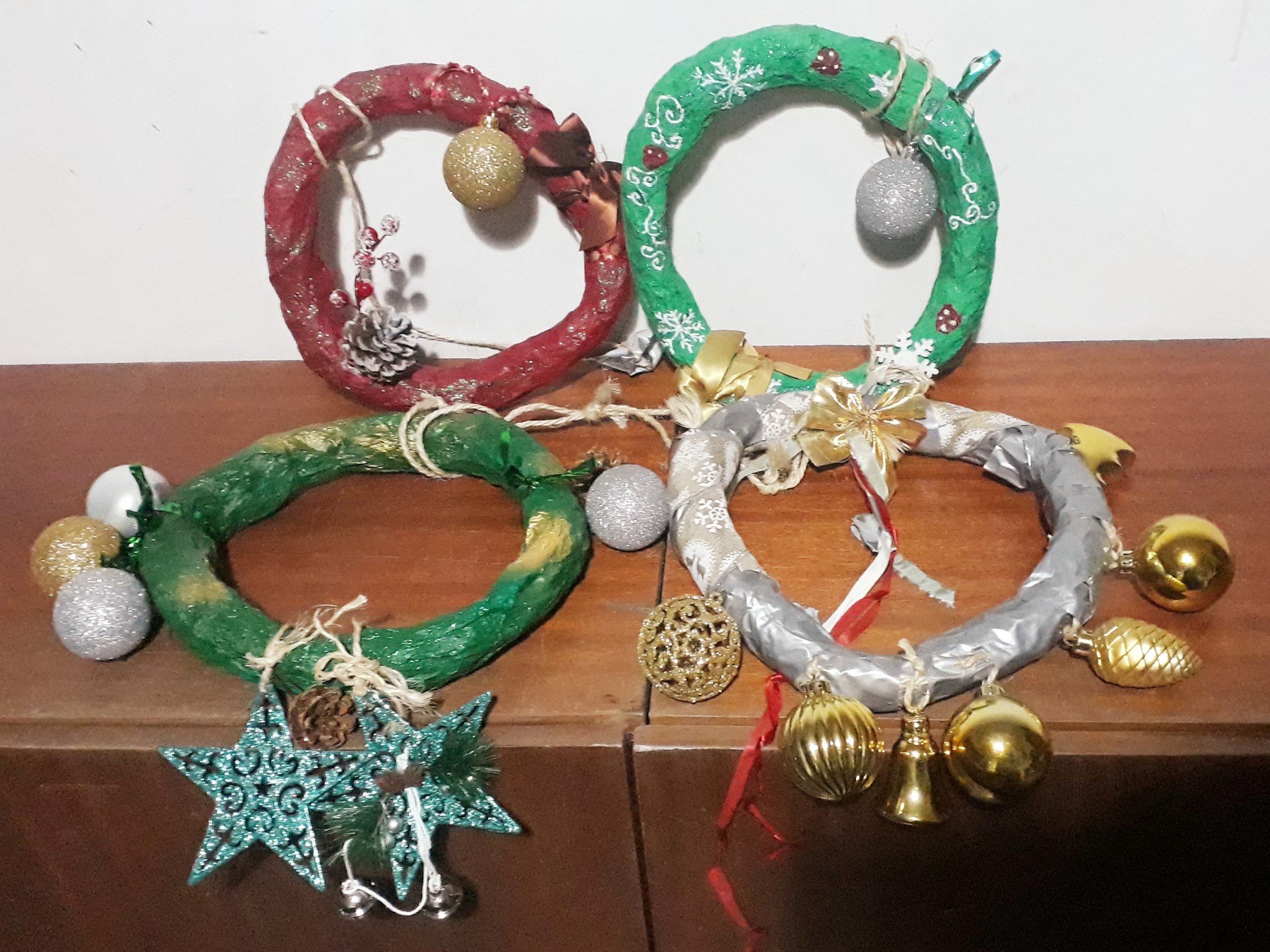 Coroas de Natal com jornal e cartão e enfeites em plástico